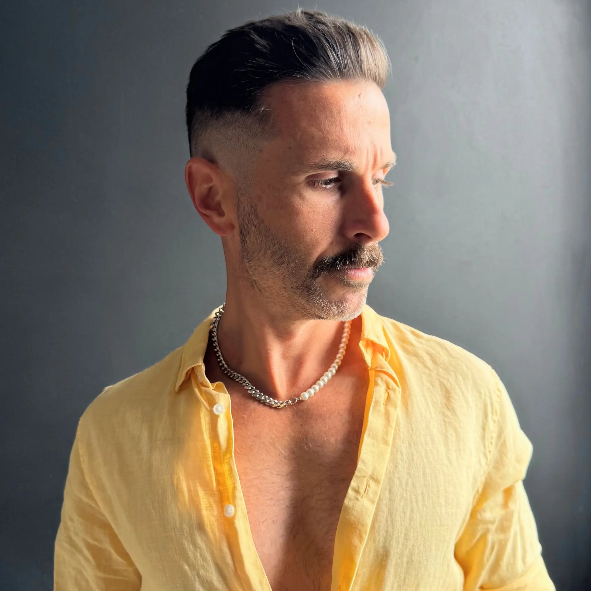 The Pearl & Stainless Steel Necklace is built for boldness. With its thick curb links, this men’s chain necklace commands attention and adds instant presence to any outfit. This is a statement chain designed for confidence. Wear it with streetwear to emphasise strength or layer it with slimmer pieces for contrast. Heavy, durable and designed to last, it’s perfect for the man who wants jewellery that makes him feel powerful and impossible to ignore.