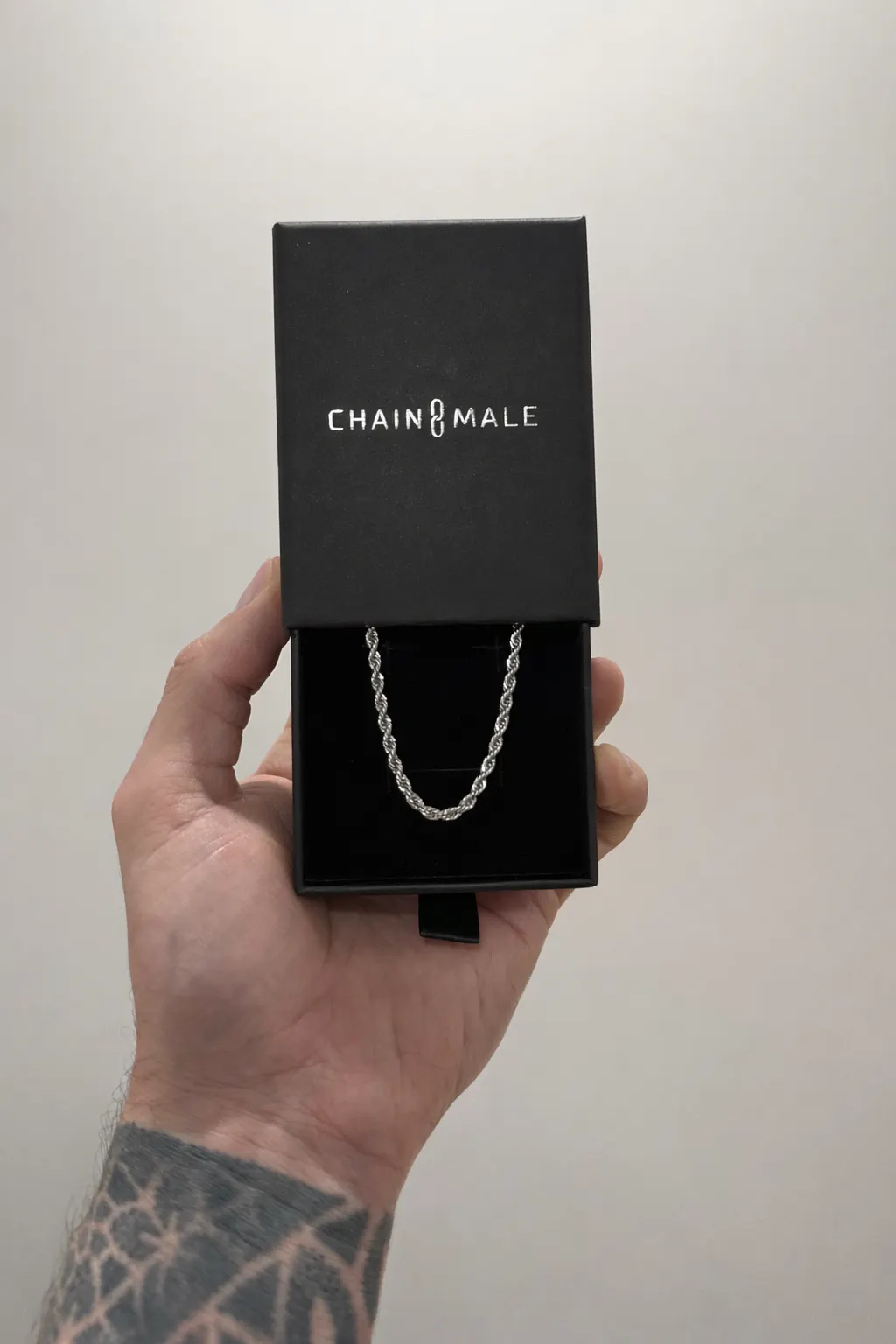 The Rope Chain is a statement in texture and shine. The silver colour catches light from every angle, giving it a clean, versatile look that pairs effortlessly with any outfit and any metal you're already wearing. This is the kind of chain that looks just as good dressed up as it does with a simple tee. Bold, detailed and built for impact.